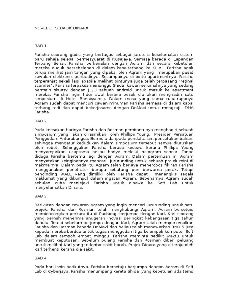 Sinopsis bab demi bab, tema, persoalan, watak dan perwatakan, latar masa, latar tempat, latar masyarakat, plot, teknik plot, nilai, . Novel di sebalik dinara sinopsis bab 11. ( bab 11 ) nam ahli : Menaipkan beberapa baris program di terminal kawalan dinara. Menjadi garang seperti kucing liar yang ketakutan. Sinopsis novel di sebalik dinara bab 1.
